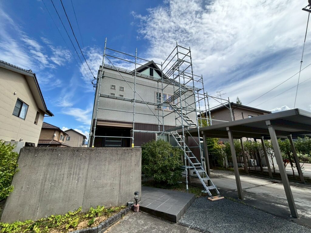 まずは高圧洗浄をし、ケレンを行います。 黒いテープは仮養生をした時のものです。