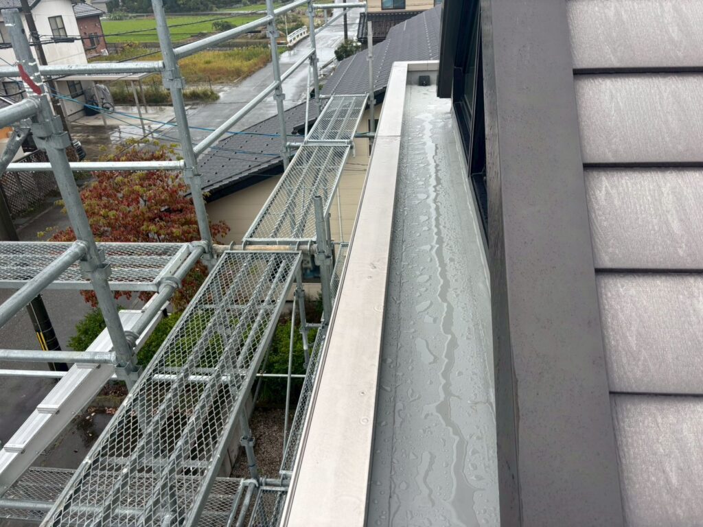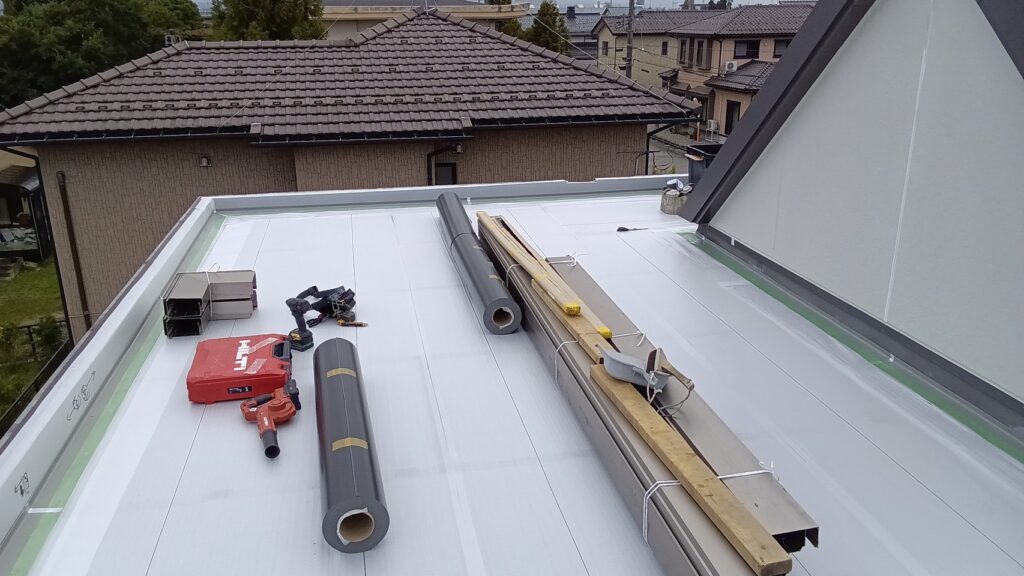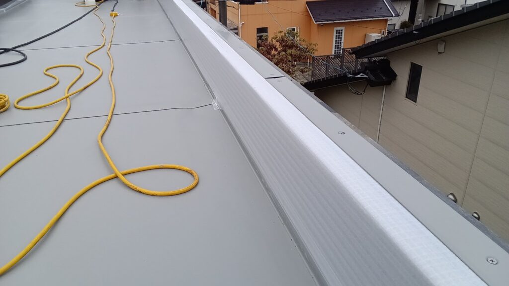 塩ビ鋼板を入隅と端部に取付け、アルミ笠木を元の位置に戻していきます。