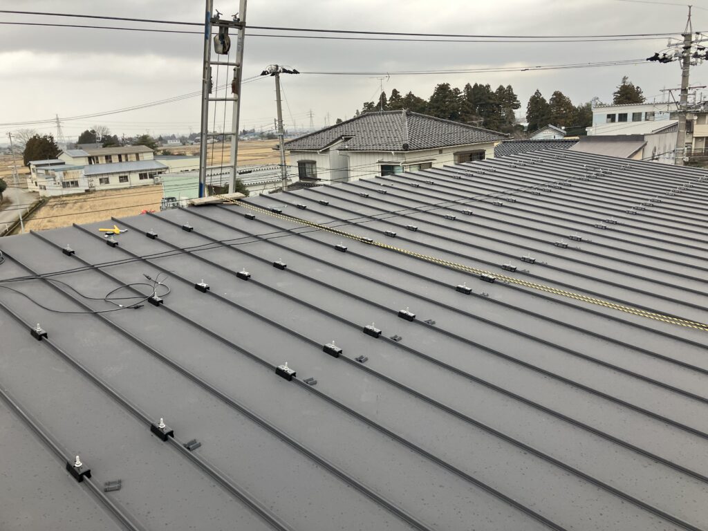 太陽光パネル設置工事よろしくお願いします。 採寸と墨出しを行い、太陽光の架台を設置します。