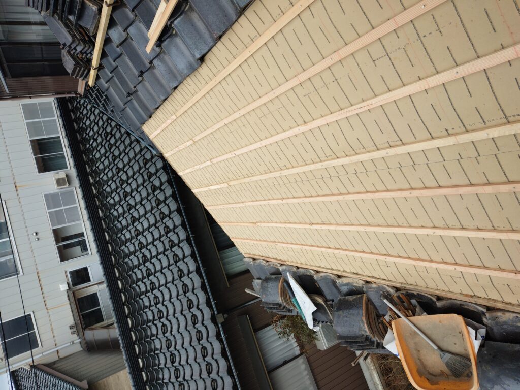 樹脂製の下葺き材を施工し、瓦桟木を取り付けます。