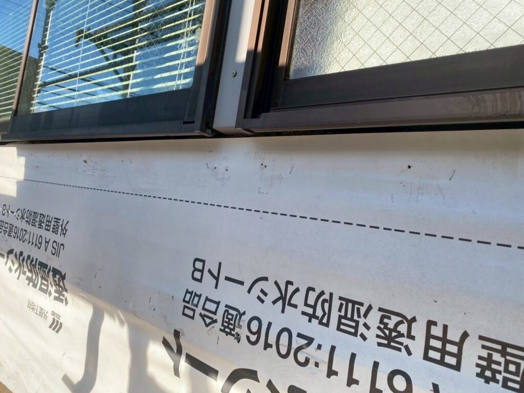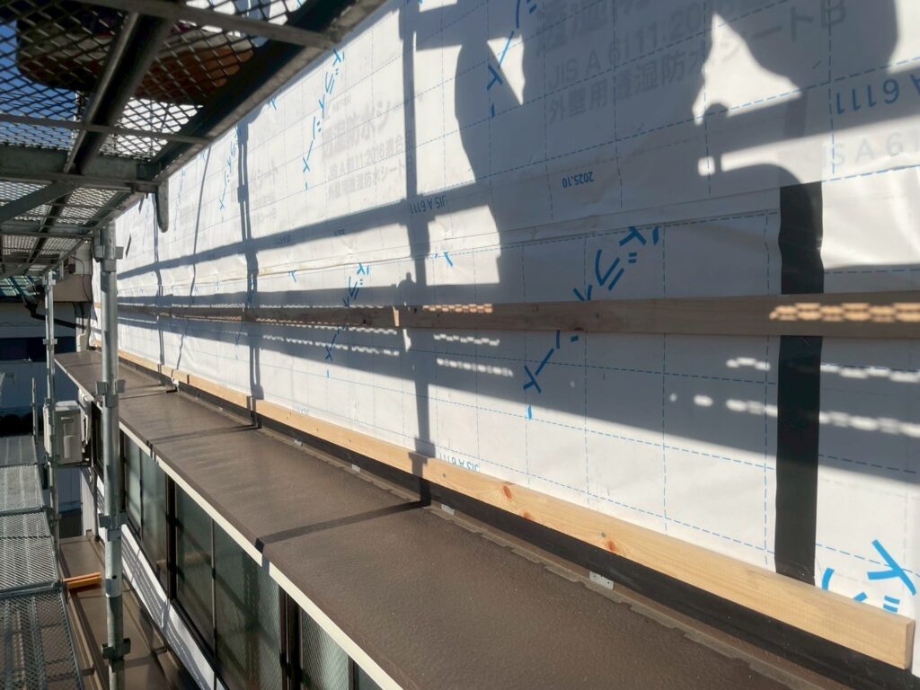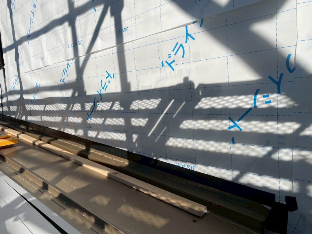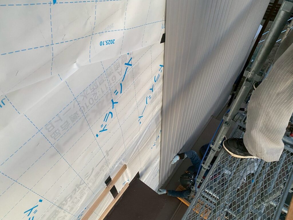 透湿防水シートを下から上へ張っていきます。 外部からの雨水は防ぎつつ、壁内部の湿気は外に排出する役割を持つシートです。